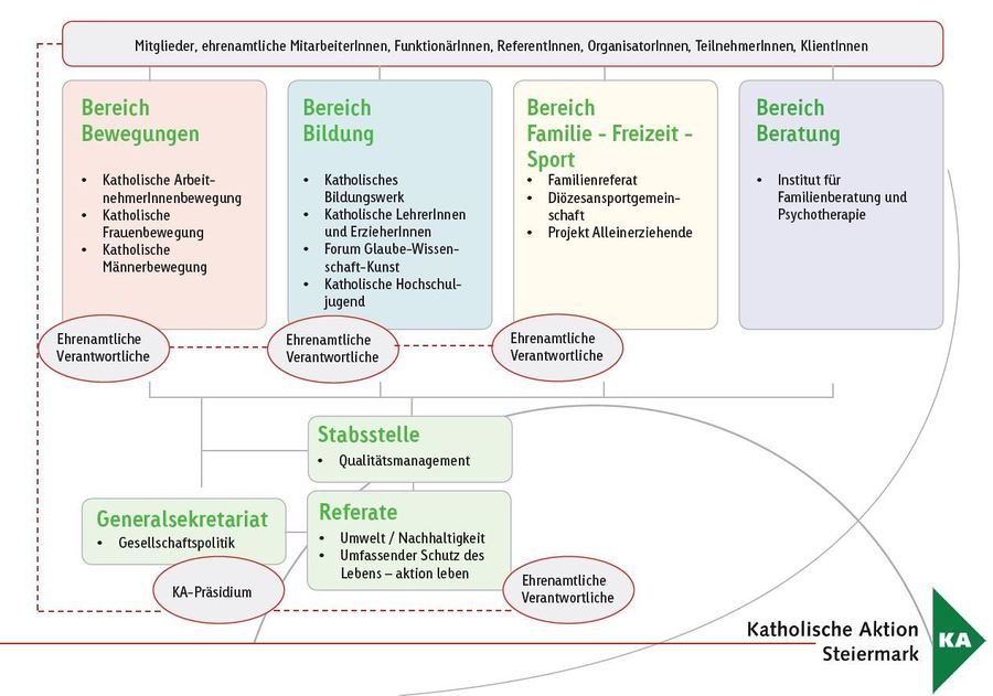 Die Katholische Aktion ist ein Netzwerk in der Diözese, deren Teilorganisationen in die Linien von Ressort Seelsorge & Gesellschaft sowie Bildung, Kunst & Kultur eingegliedert sind. Die hauptamtlich Verantwortlichen der TO bilden gemeinsam das KA-Leitungsteam, das vom/von der GS regelmäßig einberufen wird. Der/die Generalsekretär/in vertritt die Katholische Aktion inner- und außerkirchlich. Jede Teilorganisation widmet sich einem (kategorialen) Thema und ist insofern Kompetenzzentrum. Als solches arbeitet sie aktiv und reaktiv für die gesamte steirische Kirche. Die hauptamtlichen Leiter/Leiterinnen entwickeln im Zusammenspiel mit den Ehrenamtlichen die ihnen anvertrauten Inhalte kontinuierlich weiter und sind für die ihnen zugewiesenen Ressourcen verantwortlich. Entsprechend ihrer jeweiligen Position in den Linien (siehe Arbeitsplatzbeschreibungen) sind sie Teil des Netzwerkes Katholische Aktion im Sinne der jeweiligen Statuten.