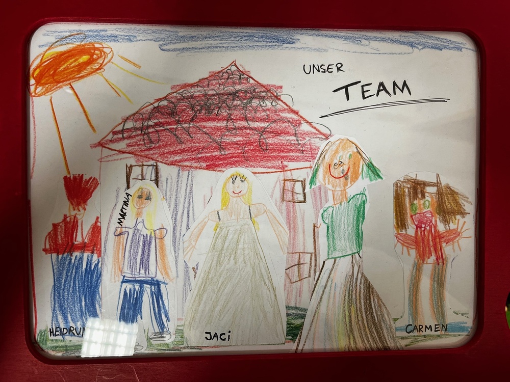 Farben der Hände: Die bunten Farben symbolisieren die Vielfalt, Wertschätzung und Toleranz, die in unserem Kindergarten gelebt werden. Jede/r findet einen Platz und ist wertvoll in seiner/ ihrer Einzigartigkeit.