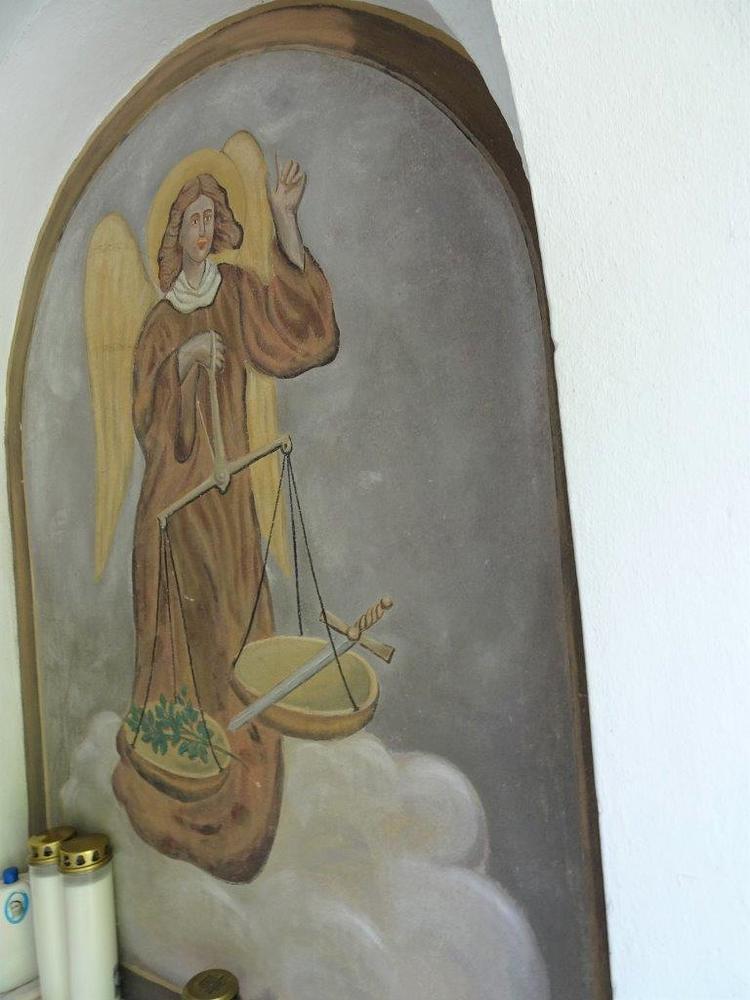 die vermutlich vom Maler Ortenberg stammten. Dargestellt sind dort auf der linken Seite die Heilige Dorathea mit den Rosen, bedeutet eigentlich „Gottes Geschenk“ (griechisch), und auf der rechten Seite der Erzengel Gabriel, bedeutet eigentlich „Mann Gottes“ (hebräisch).