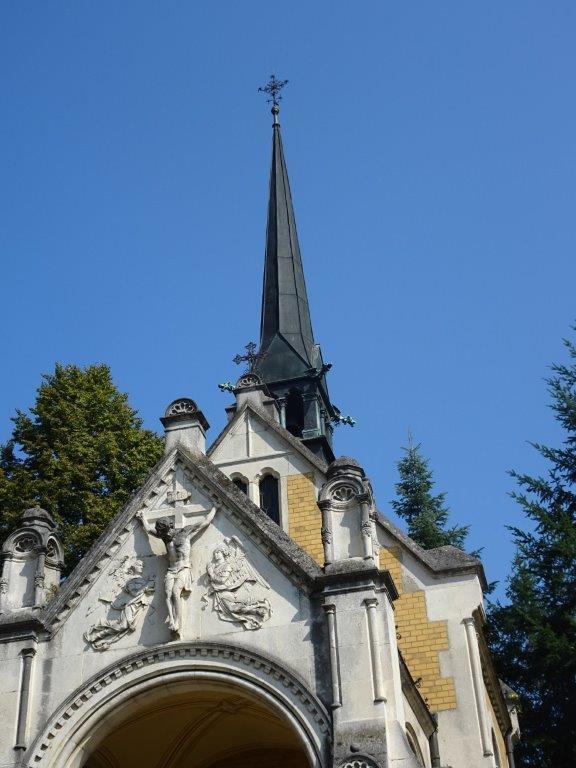 Die 1898 fertig gestellte Grabkapelle zählt wohl zu den schönsten Grabmonumenten und befindet sich am Areal der Mayr-Melnhof`schen Familiengruft im östlichen Bereich des Ortsfriedhofs in Adriach. Dieses für die Gruft und den neuen Friedhof der Pfarre Frohnleiten benötigte Grundstück hatte Freiherr Franz Mayr von Melnhof der Gemeinde gestiftet. Auftraggeber der Gruft war Franz III. Freiherr Mayr von Melnhof (1854 – 1893), Guts- und Werksbesitzer, Gründer der heutigen Kartonfabrik in Frohnleiten und Landtagsabgeordneter. Nach seinem frühen Tod 1893 wurde er als Erster der Familie darin beigesetzt. Dieses schöne Zeichen des Glaubens befindet sich am hinteren Ende des mit Zinnen bewehrten, ummauerten Bereichs und ist über flache Freitreppen erreichbar. Die Kapelle besteht im Kern aus einem einfachen Baukörper mit quadratischem Grundriss und Pultdach. Die Mauern sind mit ockerfarbenen Tonfliesen aus den Wienerberger Ziegelwerken verkleidet. Das Dach ist von einem hohen Dachreiter bekrönt, einem Aufbau aus Metall, der mit einer Glocke ausgestattet und mit auffälligen glasierten Ziegeln gedeckt ist. Dem Eingang der Kapelle ist eine niedrigere, steinsichtige Vorhalle vorgesetzt, die sich nach drei Seiten in runden Bögen öffnet. In die Brüstung ihrer Stirnseite ist eine wappenbekrönte Tafel eingelassen, die mit rührenden Worten an den verstorbenen Erbauer erinnert: „Das schönste Los ward ihm auf Erden, Im Giebelfeld der Grabkapelle prangt eine Skulptur des gekreuzigten Christus, flankiert von Engeln. Mit dem spitzen Türmchen und den hohen Giebeln, dem reichen Skulpturenschmuck bis hin zu den monsterhaften Wasserspeiern erinnert das Bauwerk an die Architektur der Gotik. Der Zugang erfolgt durch die Priestergruft, eine aufwändige Säulenhalle mit drei großen Bögen. Dort fanden die in Frohnleiten verstorbenen Servitenpatres und der verdienstvolle Obmann des „Vereins der Freunde der Kirche Adriach“, OSTR Msgr. Johannes Parizek (1915 – 1996), ihre letzte Ruhestätte. Johann Melinz |