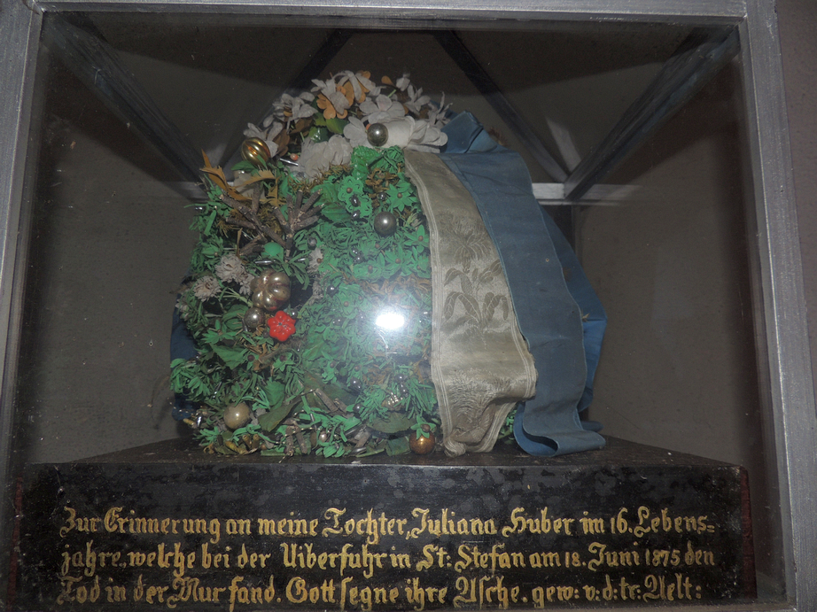 Im Kirchenraum rechts ist ein kunstvolles Bild der Heiligen Familie und links erinnert die Brautkrone an das große Fährunglück von 1875, mit dem Text darunter: “Zur Erinnerung an meine Tochter, Juliana Huber im 16. Lebensjahre, welche bei der Uiberfuhr in St. Stefan am 18. Juni 1875 den Tod in der Mur fand. Gott sege ihre Asche. gew.v.d.tr.Welt.”