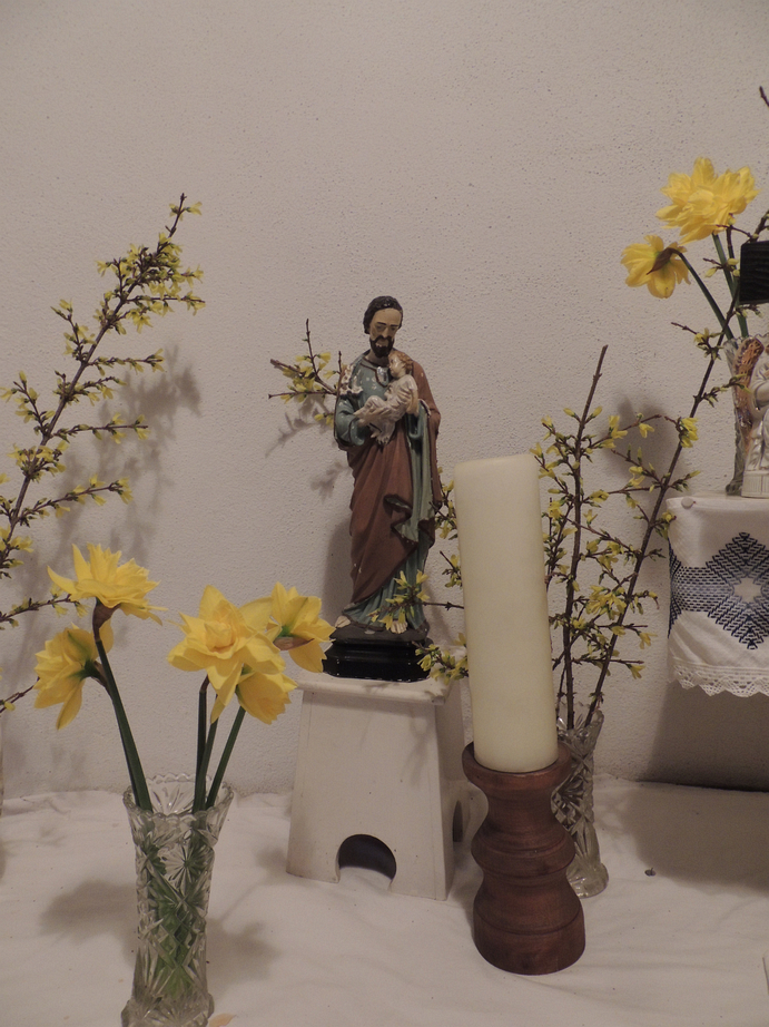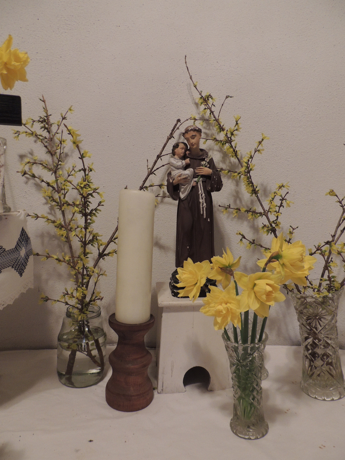 Der fix verbaute alte Altartisch geht über die ganze Breite. Er ist hohl, hat in der Mitte der gemauerten Vorderseite ein Holzkreuz und die Tischplatte ist aus Holz. Zentral auf dem Altar mit hohem Sockel steht eine Marienstatue (Gips) in blauem Gewand mit gesenktem Blick und mit Jesus, den sie präsentiert. Jesus in weißem Gewand breitet segnend die Hände aus und am Gewand ist ein offenes Herz. Zu Füßen der Statue am Sockel sind noch zwei kleine Engel; darüber an der Deckenkante ein Bild von Maria und Jesus. Hier sitzt Maria auf einer Wolke und hält Jesus im Schoß. Sie blickt auf Jesus, der hingegen auf den Betrachter blickt. Auch hier schweben zwei Engel (eigentlich nur die Köpfe und Flügel) um den Kopf von Maria. Links auf einem Podest an der Wand steht die Figur des Heiligen Florian und gegenüber der Heilige Leonhard. Auf niedrigeren am Altartisch stehenden Sockeln steht links der Heilige Josef mit dem Jesuskind am Arm und auf der rechten Antonius, auch mit dem Jesuskind am Arm. Zentral in der Mitte davor ist ein Kruzifix aus dunklem Holz und hellem rötlichen Korpus.