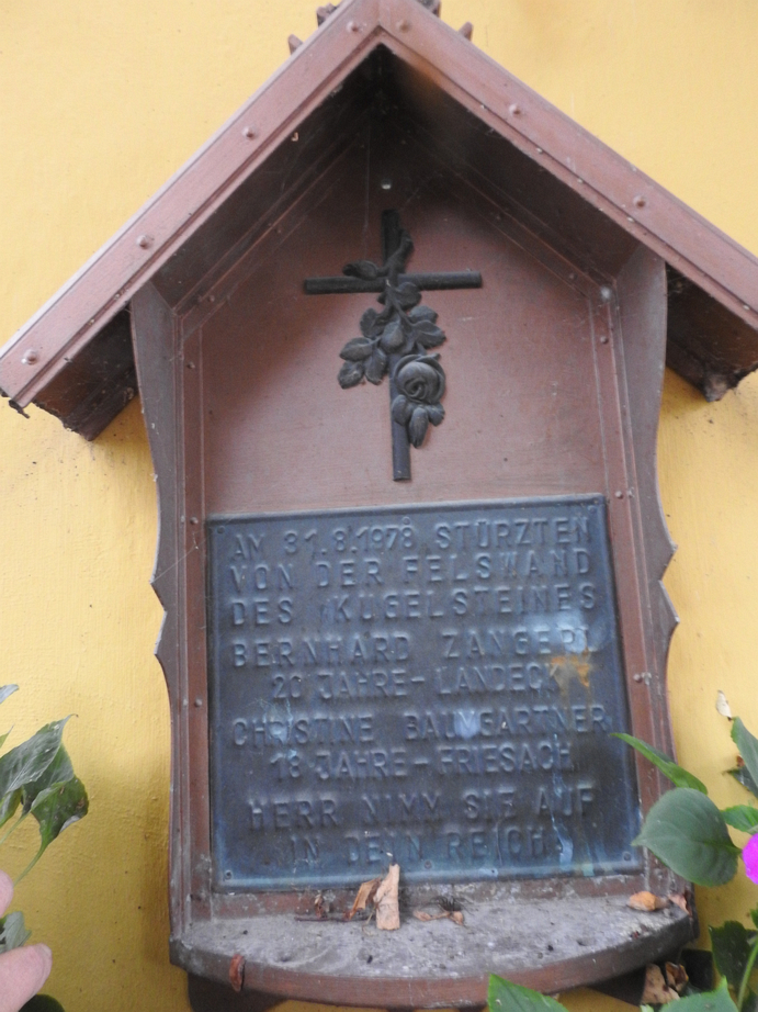 Auch ein Holzmarterl außerhalb der Kapelle, links neben der Tür, erinnert mit einer Texttafel aus getriebenem Kupfer an ein Unglück: “Am 31.8.1978 stürzten von der Felswand des Kugelsteines Bernhard Zangerl 20 Jahre – Landeck, Christine Baumgartner 10 Jahre – Friesach, Herr nimm sie in dein Reich auf.” Die Tafel wurde von den Tiroler Eltern des verunglückten Mannes gestiftet.