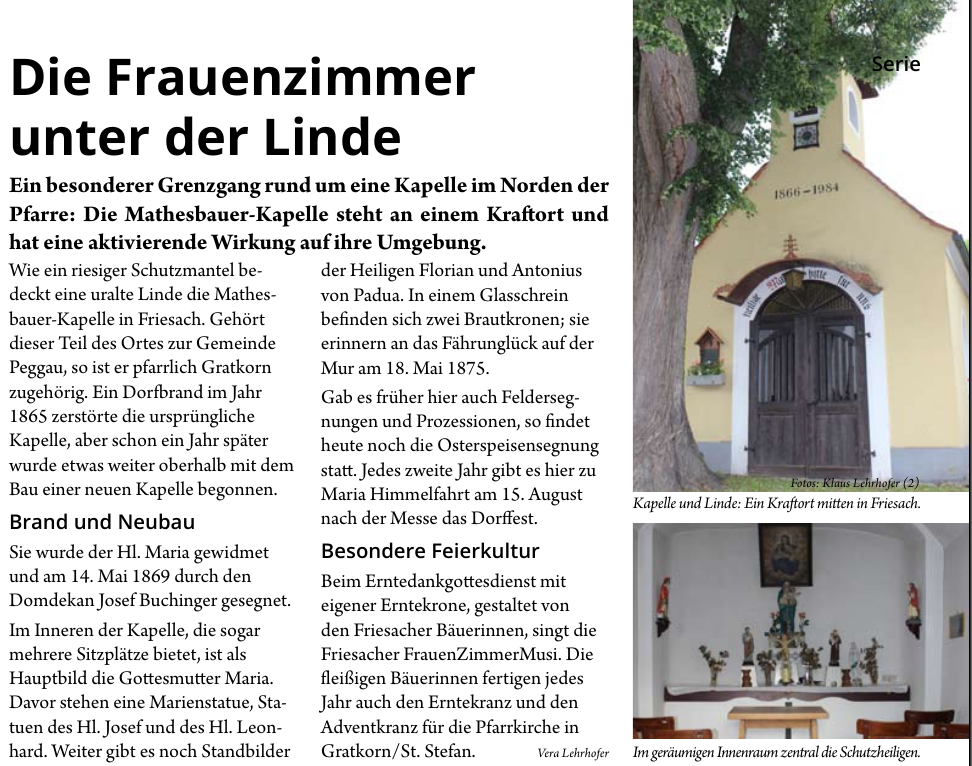 Beschreibung: Die Kapelle wird auch Friesach-Kapelle oder Dorfkapelle Friesach genannt. Eine Vorgängerkapelle, die beim Dorfbrand 1865 abgebrannt ist, stand ca. 20 – 30 m unterhalb dieser Kapelle. Im franziszeiischen Kataster ist diese leider nicht eingezeichnet.