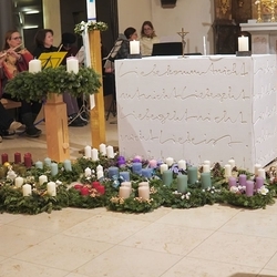 Bei der Wort-Gottes-Feier am Sonntag sprach WGF-Leiterin Christa Habith in Bezug auf Jesaja von der uralten Sehnsucht der Menschen nach Frieden und Gerechtigkeit. Nur durch Umkehr, siehe Johannes der Täufer (Mt 3, 1-12), kann Veränderung geschehen und Gott in uns ankommen. Umkehren heißt Haltungen überdenken, Altes verlassen und die Herzen öffnen.