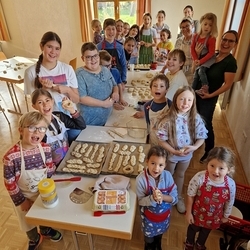 Dank Elena im Kindergarten Premstätten hatten sie neben dem Herd im Pfarrhof auch noch zwei weitere Herde in Verwendung, um die große Menge an geformten Teiglingen zu Köstlichkeiten zu verwandeln.